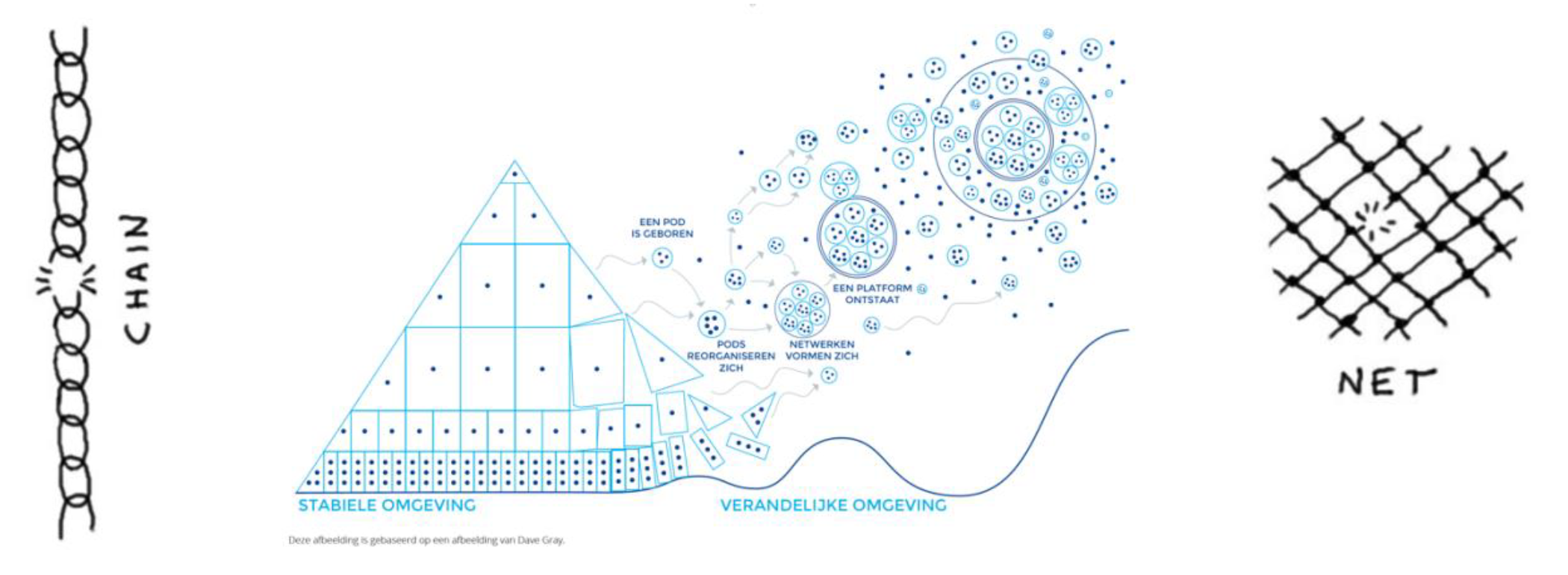 Een podulair systeem is als een net. Het verdeelt de werklast over een groter gebied doordat elke pod zich kan concentreren op doelen in plaats van op stappen of fasen. Als één streng breekt, kan het systeem de last nog steeds dragen. In een podulair systeem ligt de last van creativiteit en intelligentie bij de mensen in een pod, een team.